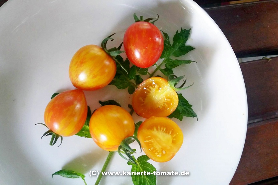 Petite tomate cerise bigarrée jaune et rose/rouge.